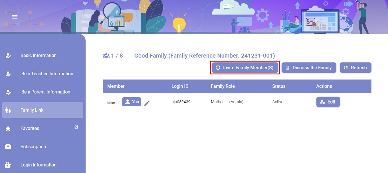 Once students and parents upgrade to membership, parents can create family groups and link family members through the EdCity system.