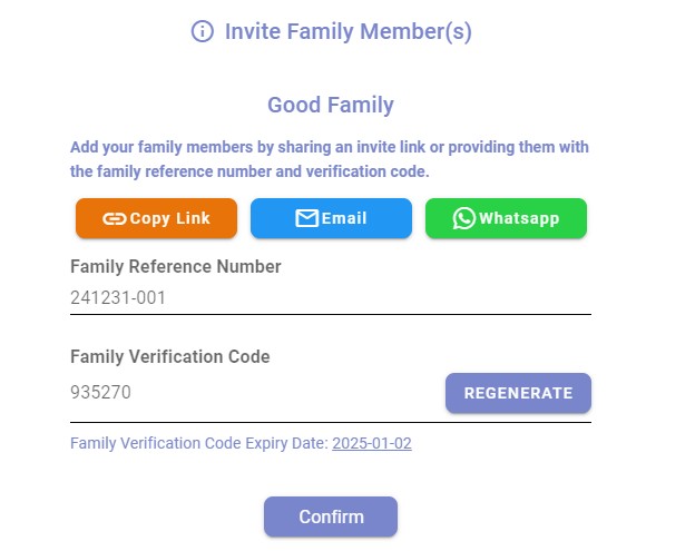 4. You can invite users either by sending a link or by having them enter the family ID and verification code to join the family.