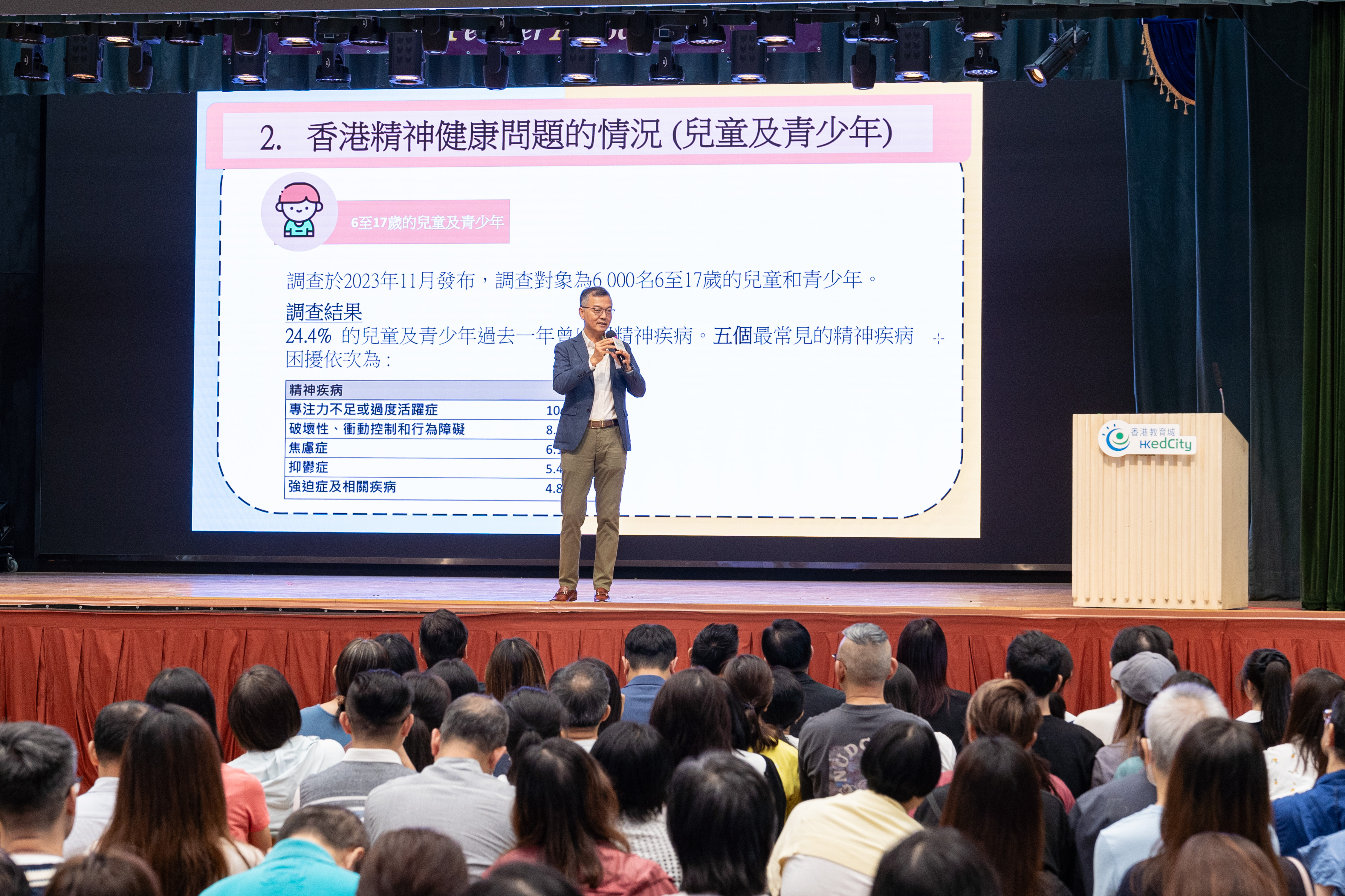 香港教育城一直关注学生的全人发展,遂与香港电脑教育学会、家庭与学校合作事宜委员会及沙田区家长教师会联会合作,于10月19日举办「精神健康对学童成长的影响及重要性」讲座,荣获行政会议成员、精神健康咨询委员会主席、香港儿科与社会医学专科林正财医生,SBS,JP向家长和学生分享本地学童精神健康的现况,聆听中学生的烦恼,并提出积极和有效的建议。
