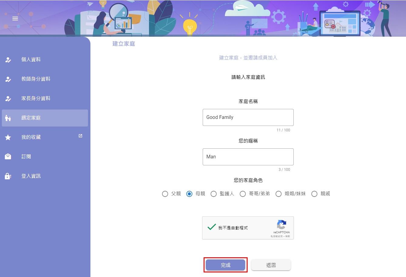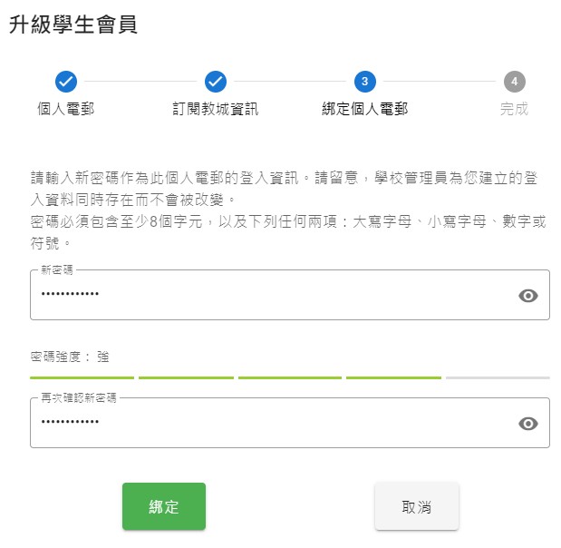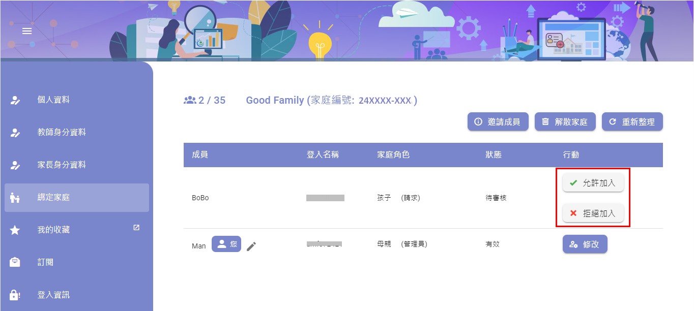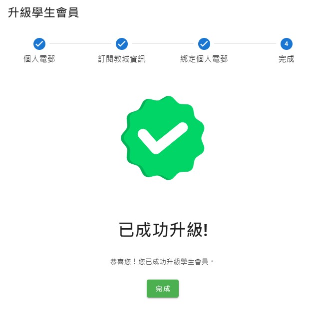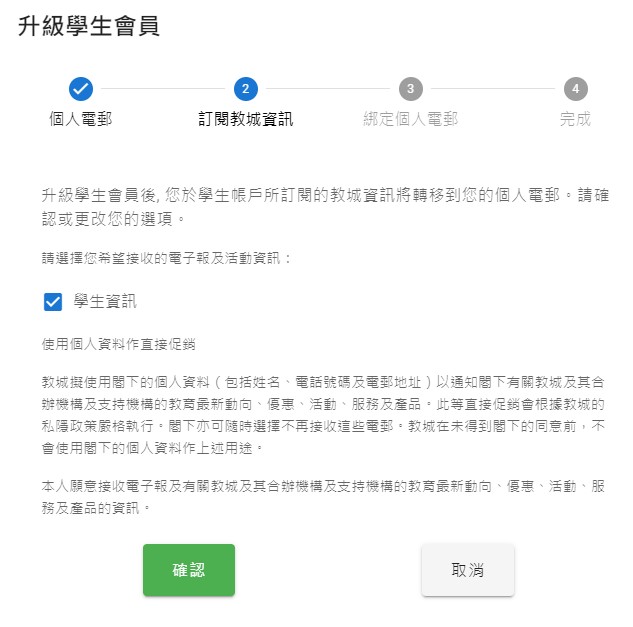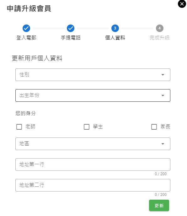 如何升級會員 會員專區 升級正式會員(家長/公眾會員) 升級學生會員 建立家庭群組 如何升級會員 要升級成為正式會員,必須通過個人電郵及手提電話號碼認證,程序簡單。 升級正式會員(家長/公眾會員) 1. 登入教城會員設定頁 並點按「升級」 2. 輸入一個可以收發簡訊的手提電話號碼 3. 輸入手機簡訊內的6位數字驗證碼 4. 完成手提電話號碼認證,按「下一步」 5. 更新個人資料 (選填) ,按「更新」 6. 完成升級會員 升級學生會員 為提供全方位個人化服務,您可以將學生校本帳戶升級至學生會員,以便自行管理會員帳戶資料及永久檢視於教城完整的用戶資料及活動紀錄,而不受升班或轉校影響。 1. 登入教城學生帳戶設定頁並點擊「升級」 2. 輸入您的個人電郵(不可使用學校提供的學生電郵) 您的個人電郵會收到一個由教城發出的會員升級電郵 3. 輸入電郵內的驗證碼 4. 更新訂閱教城資訊 5. 為個人電郵的登入設定新密碼 6. 完成學生會員升級 如何建立家庭群組 當學生及家長升級成為會員後,家長便可透過教城系統建立家庭群組和綁定家庭成員。 建立家庭群組第一步-建立家庭和綁定家庭 1. 於設定頁「綁定家庭」點擊「建立家庭」 2. 輸入家庭群組資訊(家庭群組名稱及您的資訊) 3. 點擊「邀請成員」 4. 您可以透過發送連結或邀請用戶輸入家庭編號和驗證碼加入家庭 5. 學生/其他家庭成員登入並以連結申請加入家庭 6. 家庭管理員可以允許/拒絕申請 7. 家庭管理員允許成員加入後,可以列表中檢視成員名單 簡易登入,輕鬆享用教城服務 為提升使用者體驗,及照顧不用人士的需要,會員及校本帳戶可選用不同登入方式,包括:使用者名稱和密碼一次性密碼登入:以個人電子郵件接收一次性密碼以二維碼登入(須向教城申請簡易登入服務)同時,教城為學校、政府部門、非牟利機構及私營企業提供EdConnect 單一登入服務 Single Sign-On (SSO)。一經審批及設定,會員可以教城會員及校本帳戶登入其他相關系統,瞭解更多
